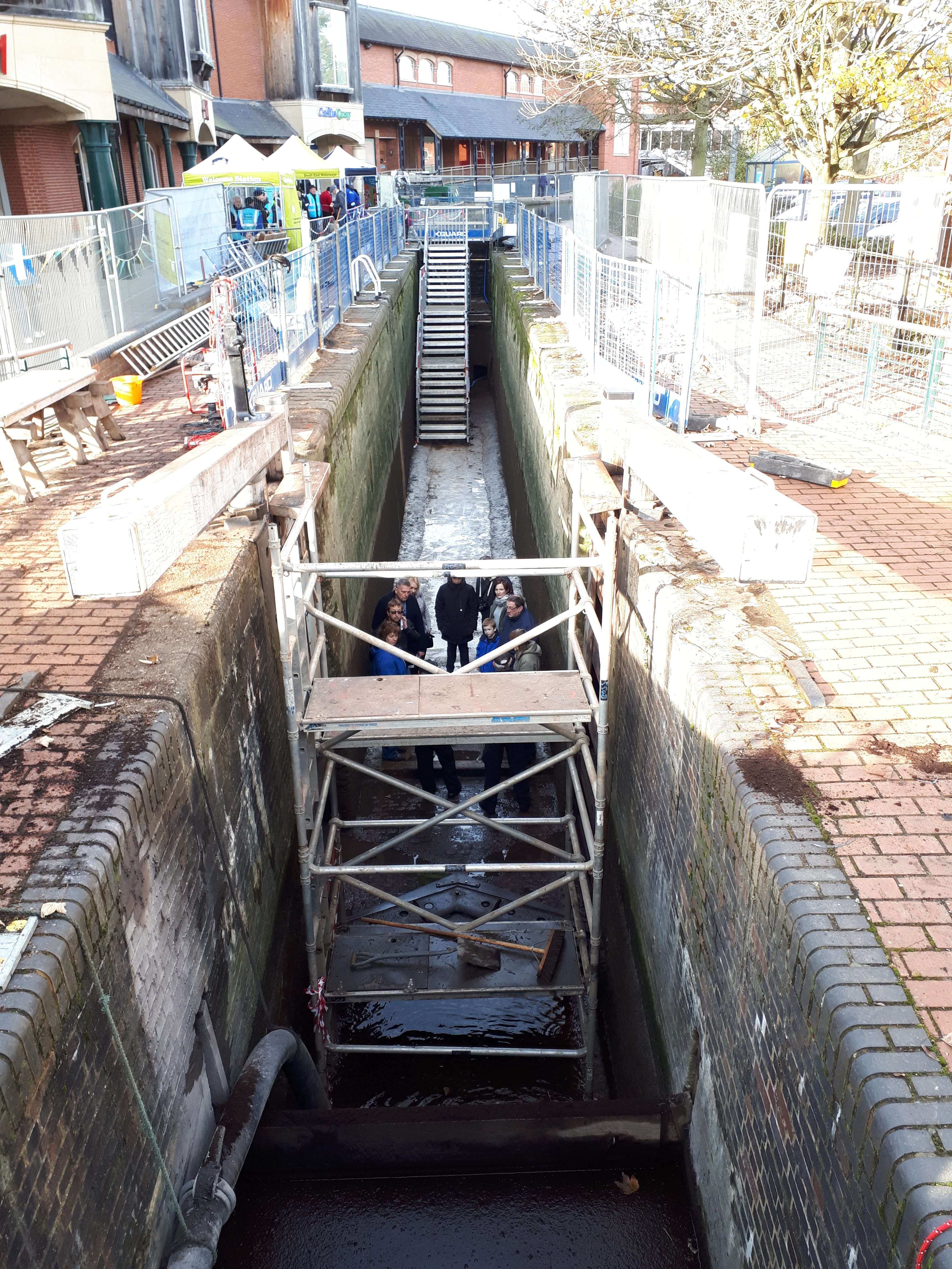 The CRT team who have been working on replacing the bottom gates of the lock in Banbury had an open day today, where the public could go into and see the inner workings of a lock. The bottom gates had already been changed – with the old ones sitting in the crane barge waiting to be taken away.