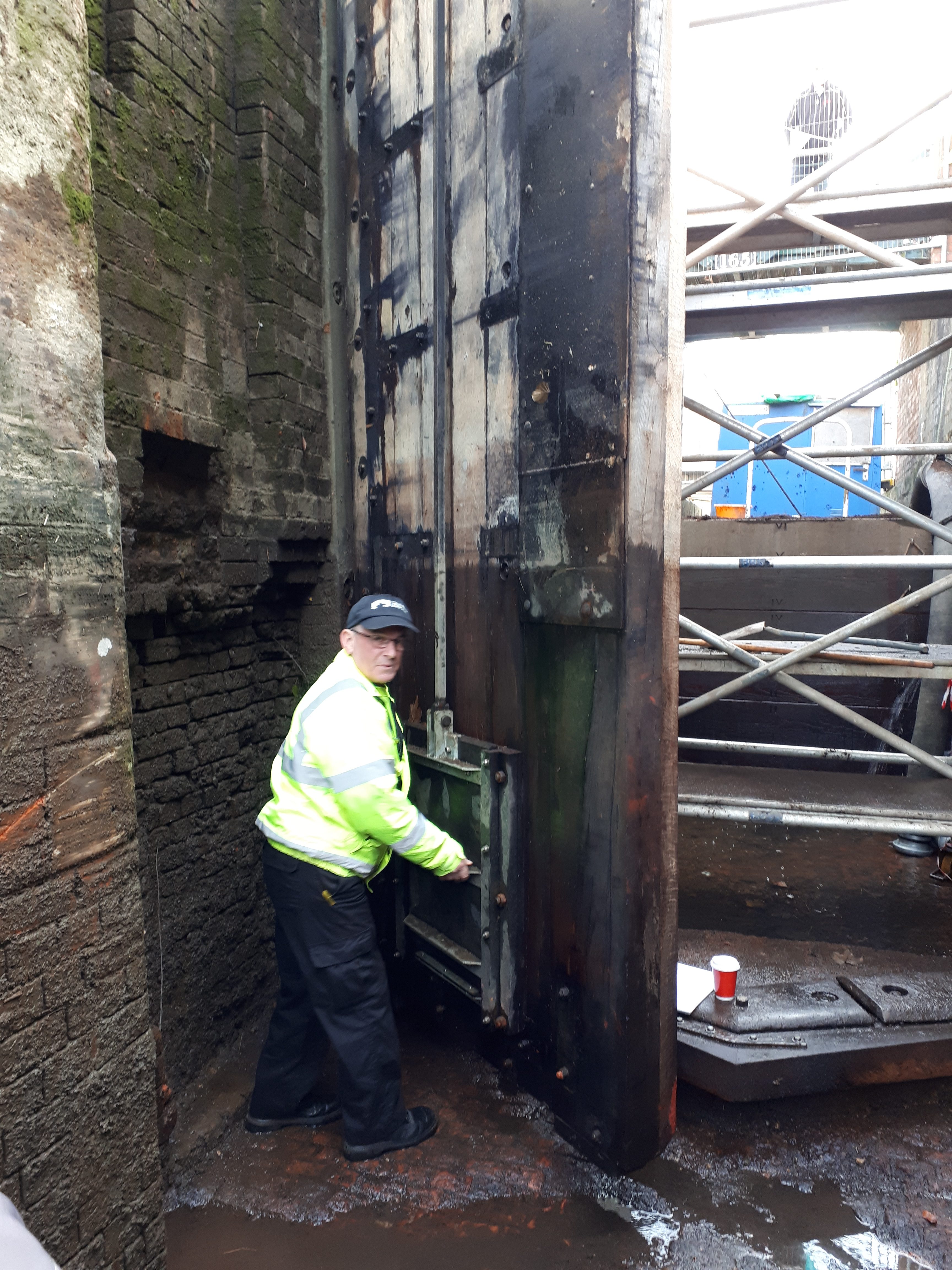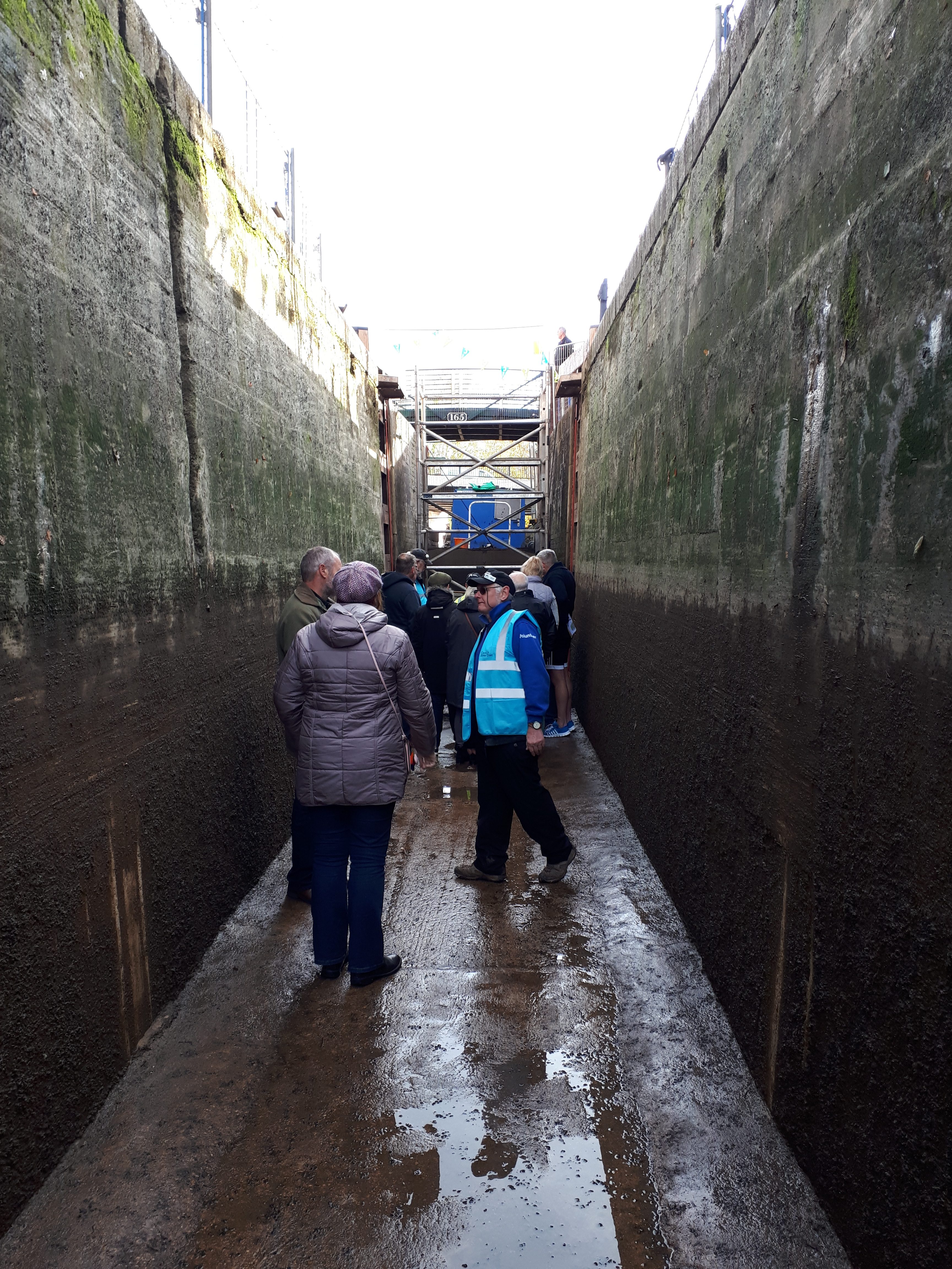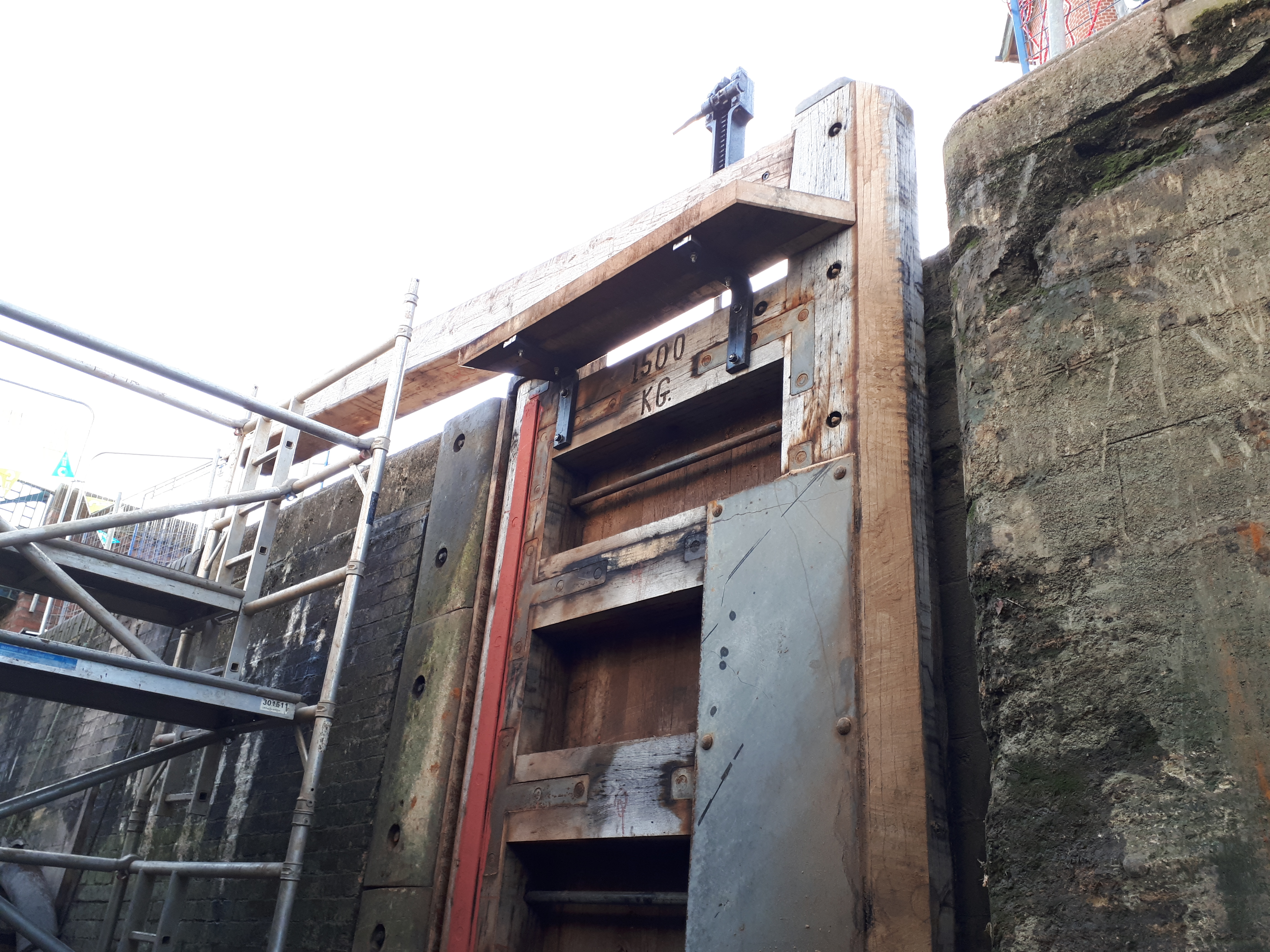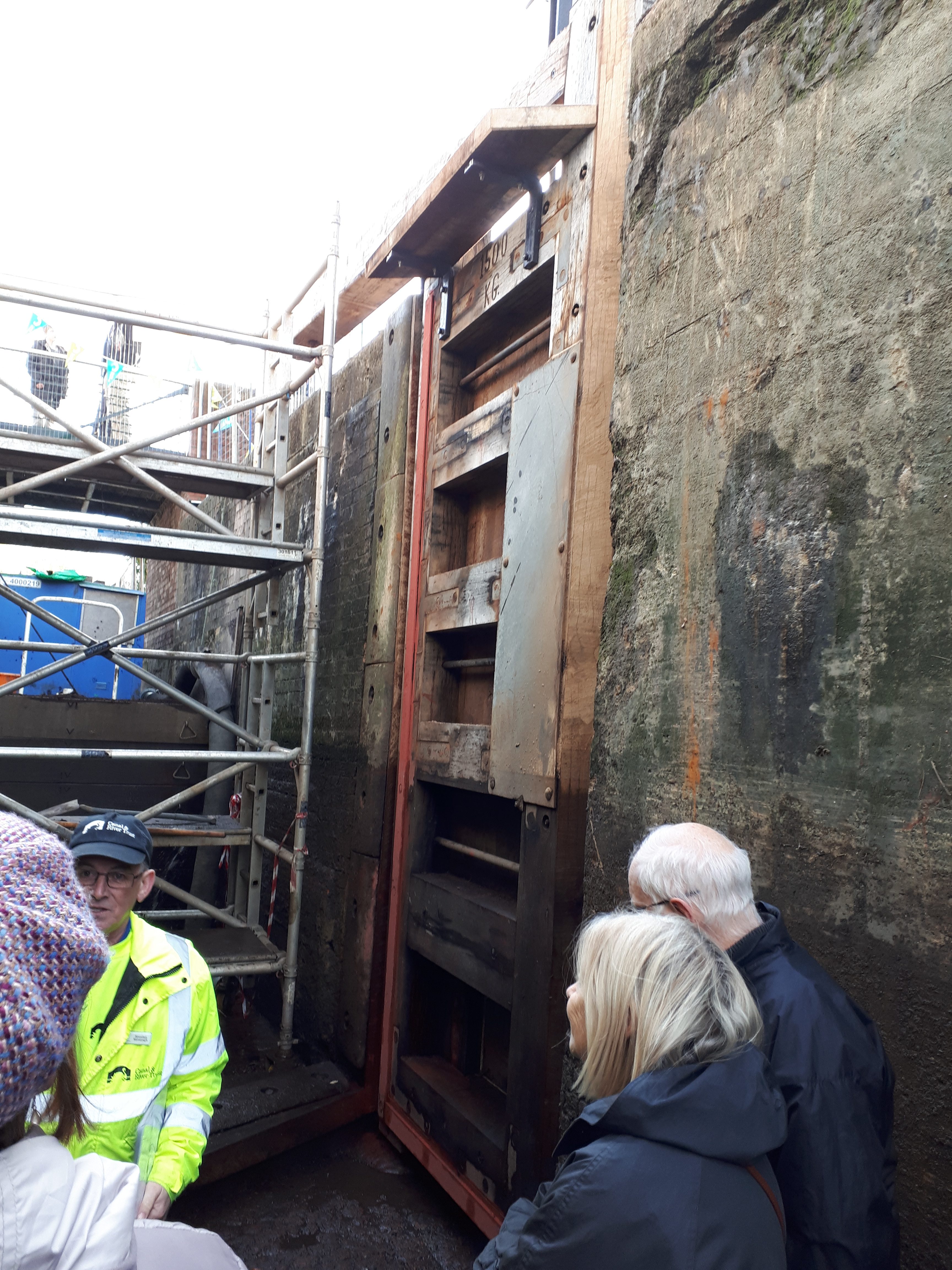 The red liners shown in the photo are ready and marked, so that when the lock is filled, any leaking water marks the paint.. and shows which part needs “shaving” to make a fully water tight seal. You may also notice that the walls of the lock are still “slimy”.. this they leave in place, as they don’t want to clean this off, in case it causes a leak in the wall by removing the growth that is sealing the bricks together..