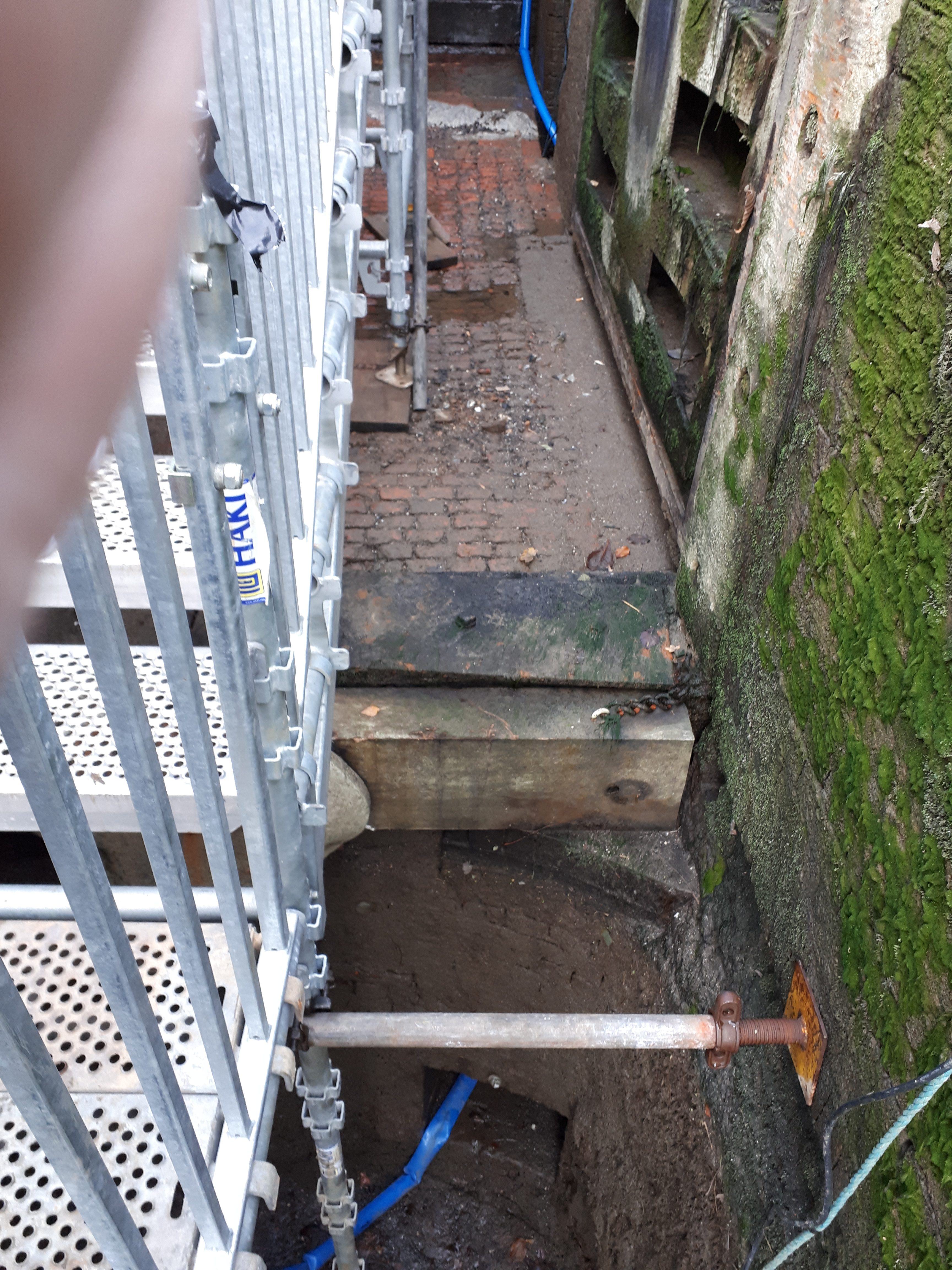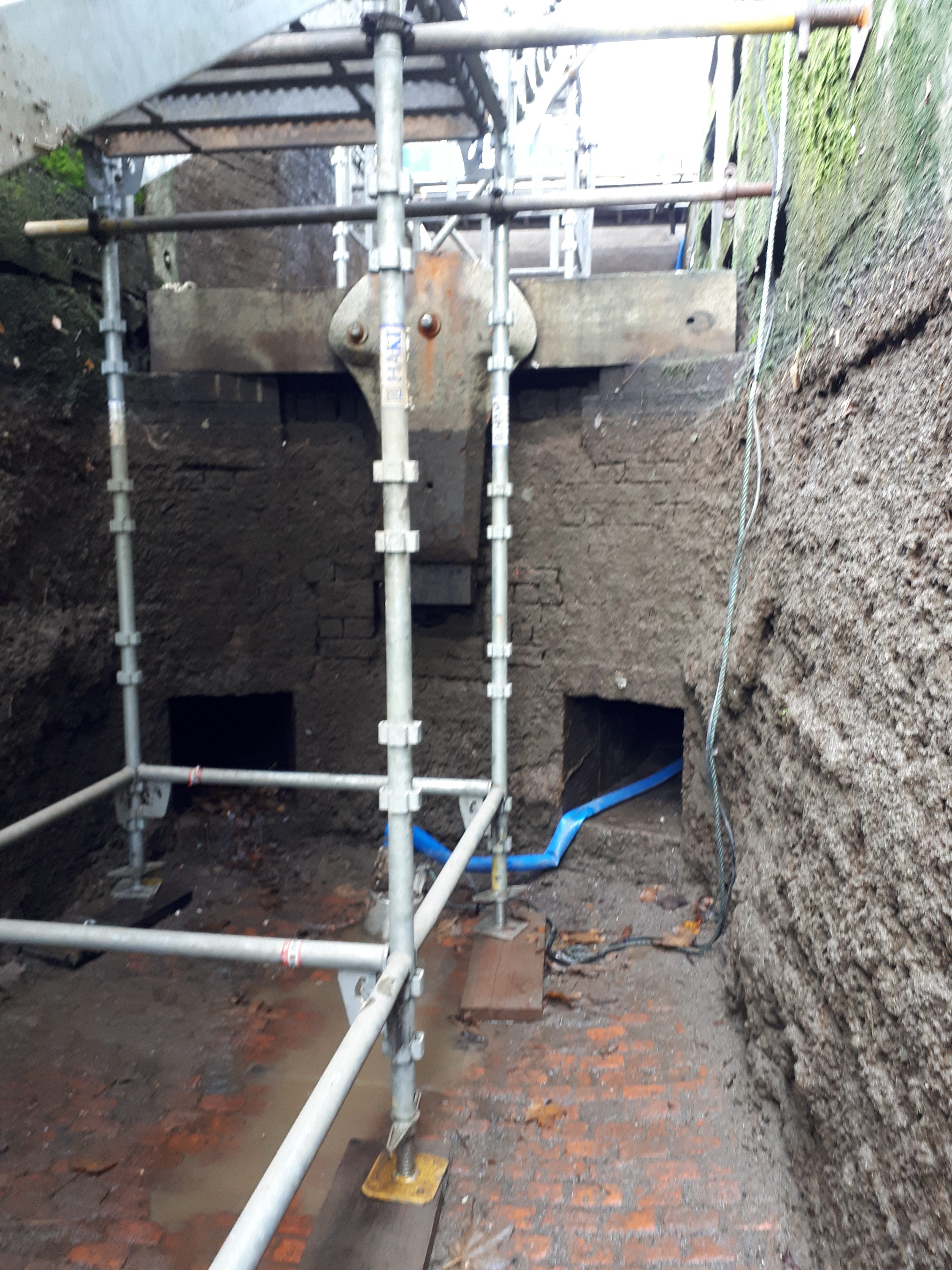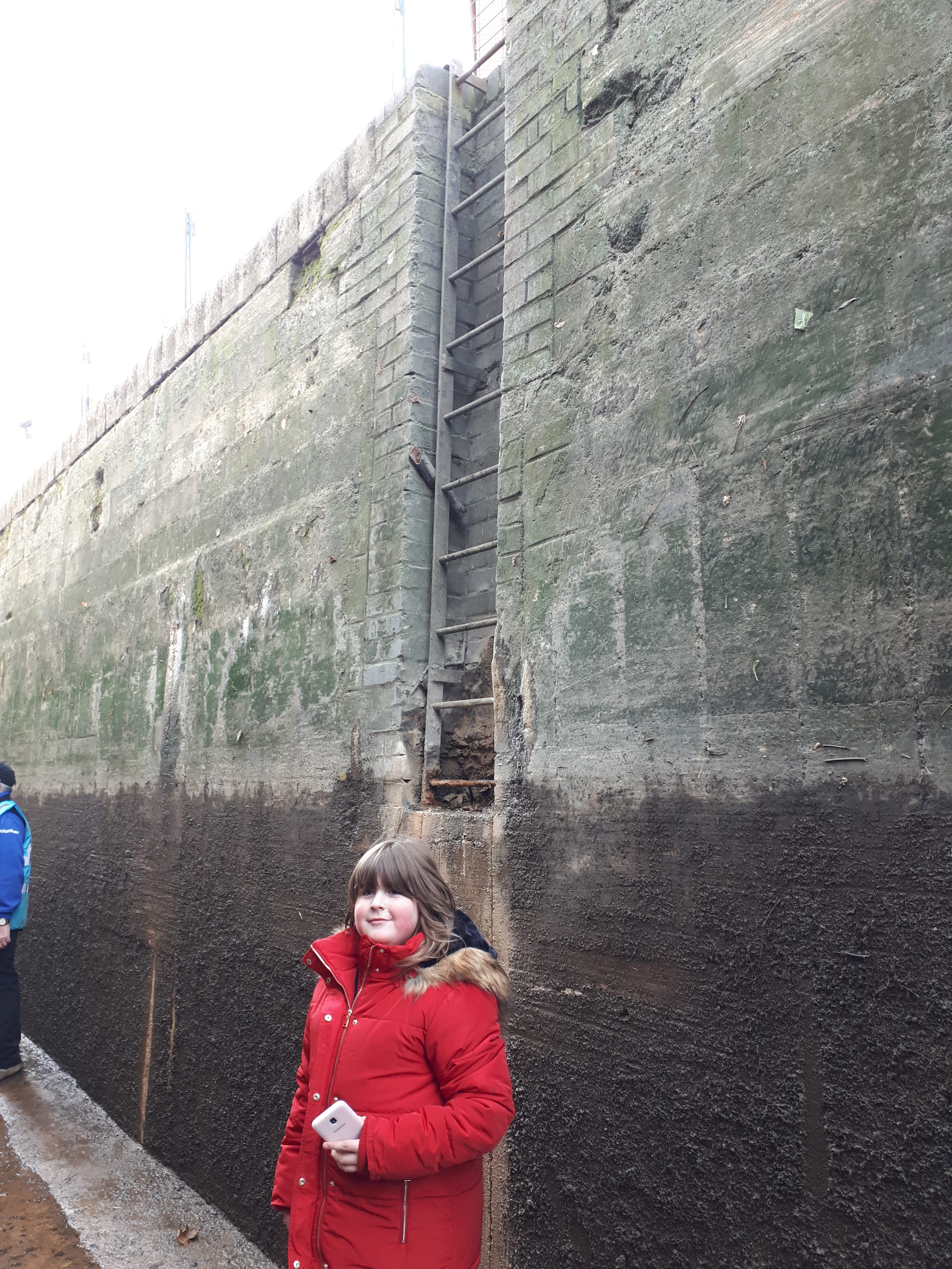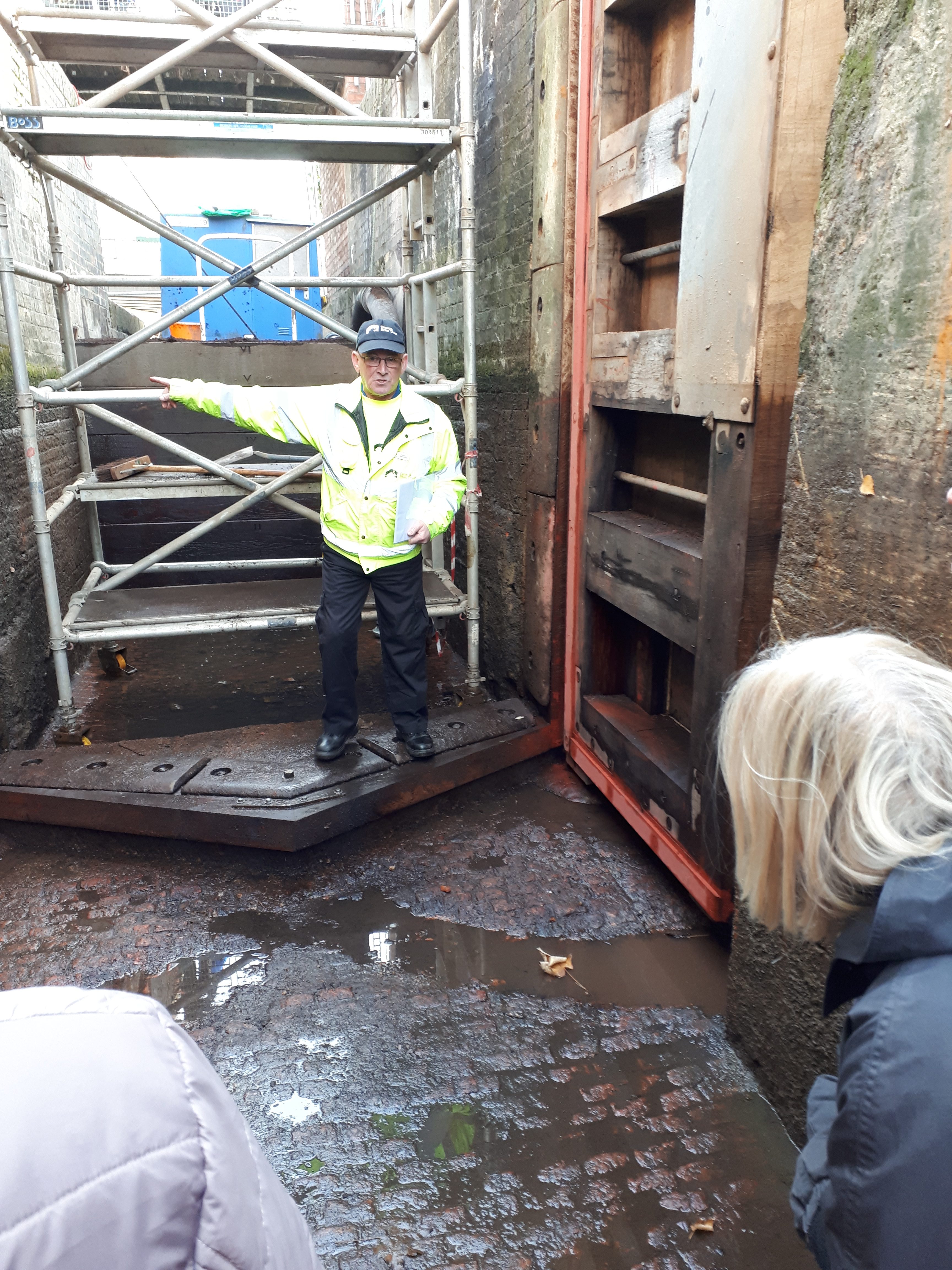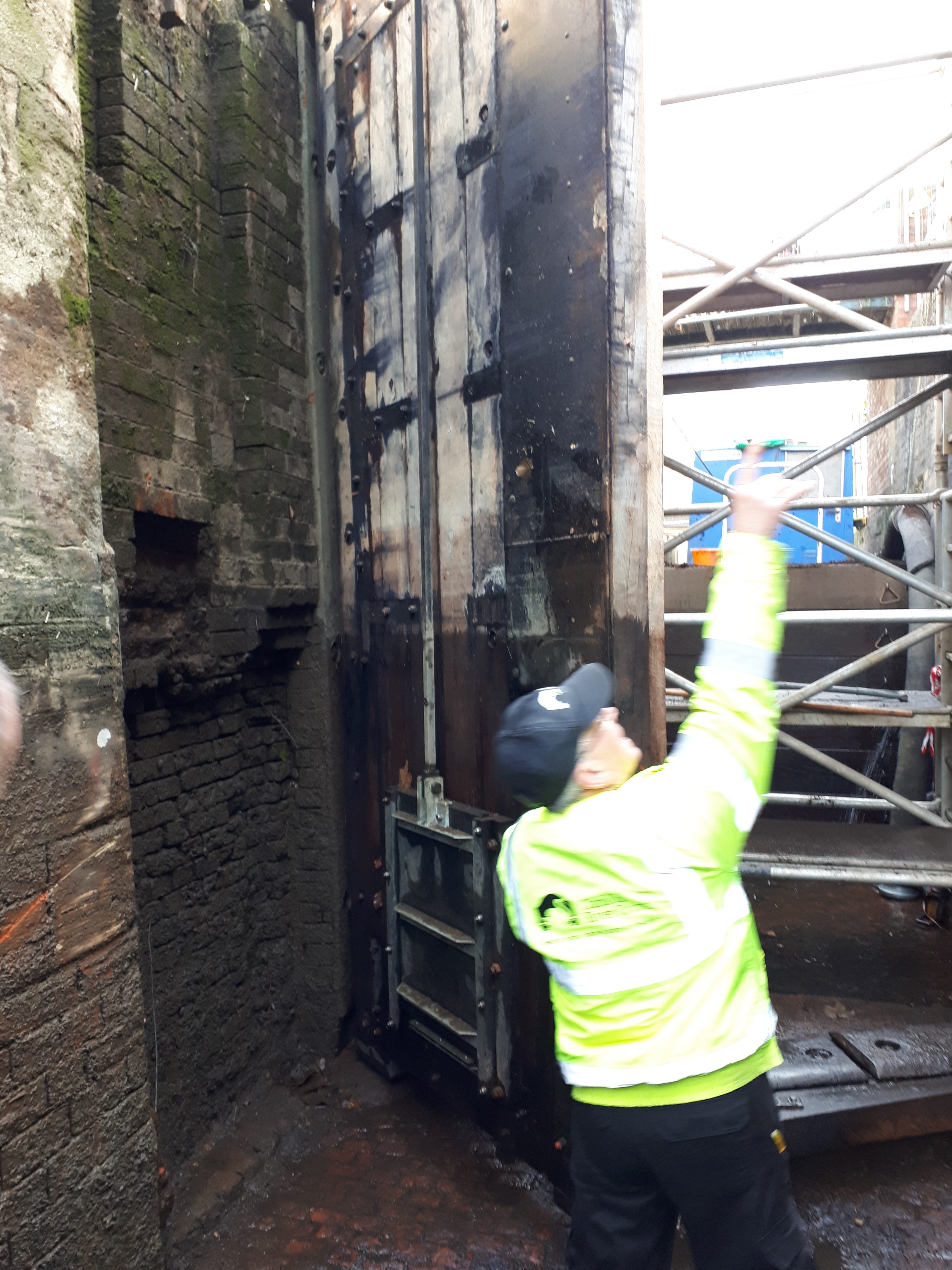 The red liners shown in the photo are ready and marked, so that when the lock is filled, any leaking water marks the paint.. and shows which part needs “shaving” to make a fully water tight seal. You may also notice that the walls of the lock are still “slimy”.. this they leave in place, as they don’t want to clean this off, in case it causes a leak in the wall by removing the growth that is sealing the bricks together..